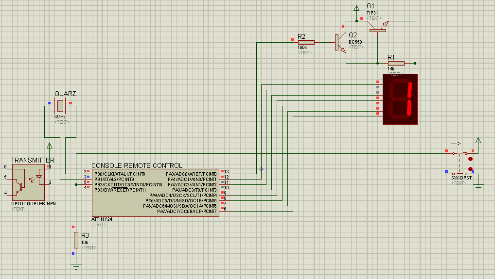 1. Ключ на буржуйских запчастях будет стоять только в проекте. На практике возьму один КТ815А. 2. Кнопка мутант. Двух выводных кнопок без фиксации у нас нет (или просто надо обегать весь город). А с четырёх ногой кнопкой не нужен диод. 3. Если верить протеусу тут они от INT0 до INT10. Я взял INT0 на ноге PA0. Подтянул к минусу. Настроил на вход Ddra = &B01111111. PB2 и PB3, один мне нужен для организации програмного UART, другой для включения/выключения индикатора на время прерывания.