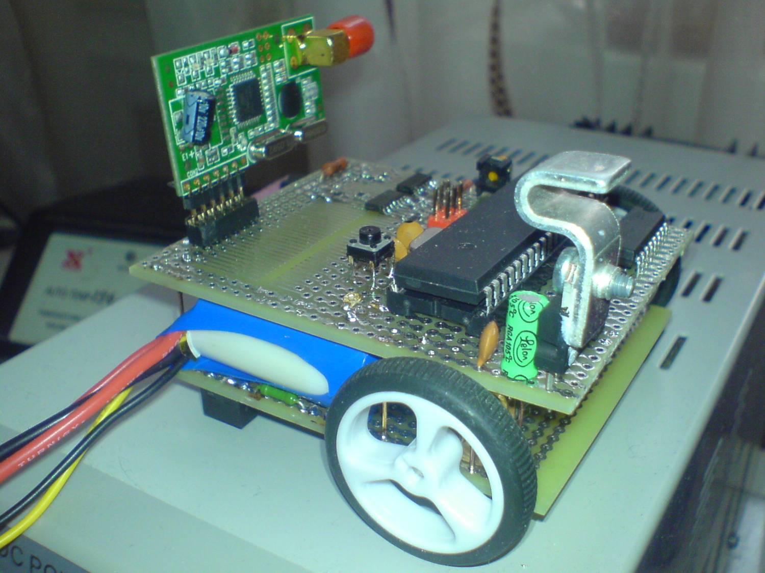 Недавно решил сделать энкодеры для робота, чтобы считать сколько проехал. Для этого я нарисовал в Front designer вот такую картинку: Распечатал, приклеил на колеса: На кусочках текстолита стоят открытые оптопары. И того 6 белых секторов, а т.к. прерывание будет происходить по перепаду уровня, то получаем 12 импульсов за оборот. Радиус колеса 13 мм, тогда длина окружности 2*3.14*13 = 81.64 мм Получаем, что 1 импульс это 6.8 мм пройденного пути. Сейчас думаю как избежать засветки оптопар, сначала сделал при помощи компаратора, но не помогло Теперь возникла замечательная мысль, модулировать ИК светодиод от микроконтроллера, т.е. настроить один из таймеров на 13.985 кГц и на эту же частоту настроить LM567 Но это чуть позже.... PS. Вскоре ворклог превратится в полноценную статью про изготовление энкодеров, подключение к МК, написание подпроограмм и тп.