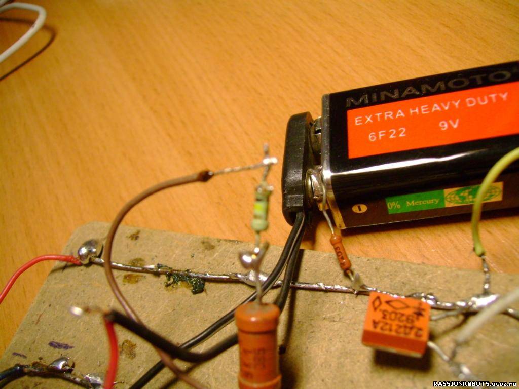вот мой робот я только схему сделал но я ещё не подцепил фотоэлемент а моторчик работает что делать? и как подцепить самодельный фотоэлемент?