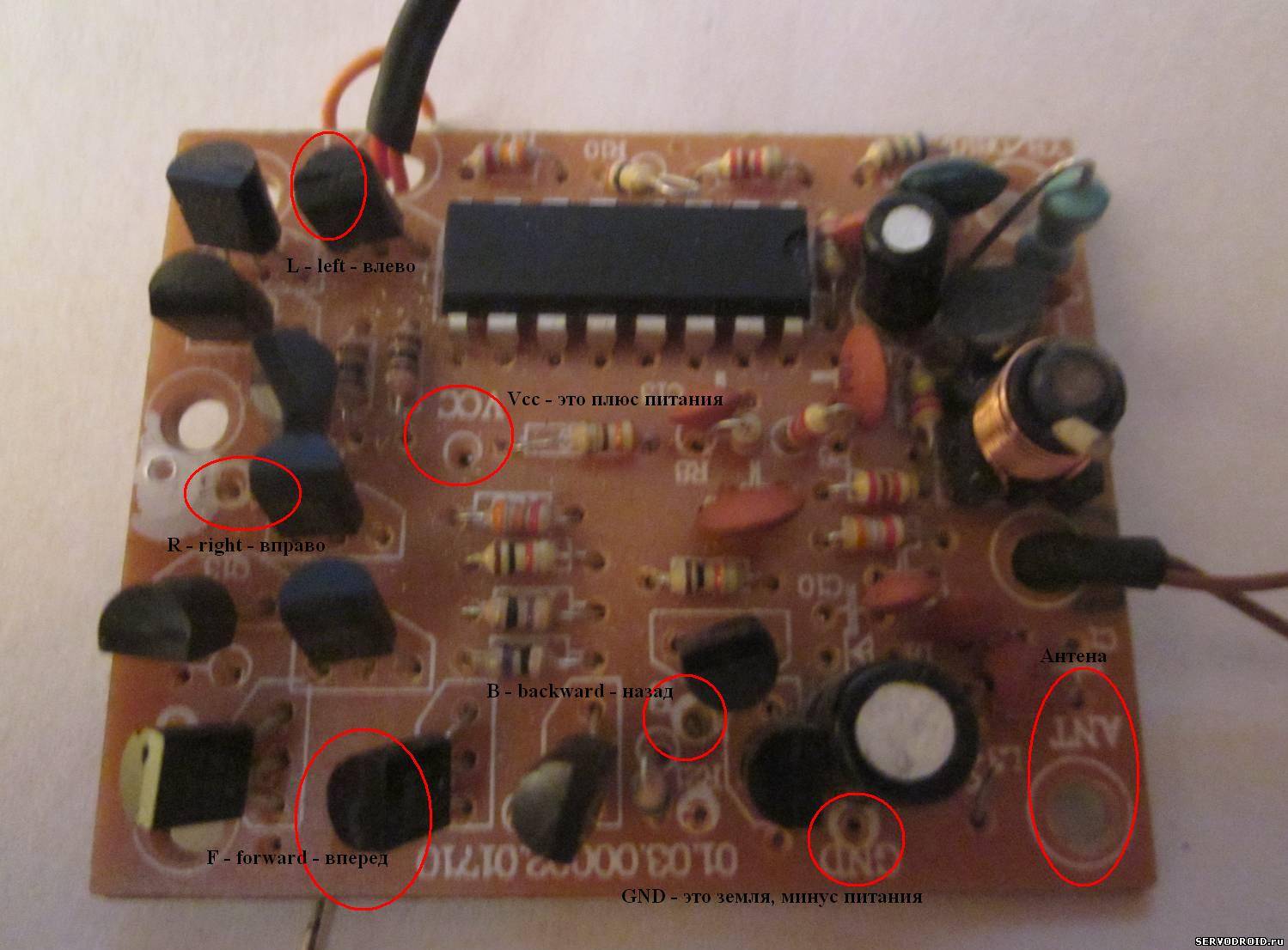 Всем доброго времени суток, тут недавно мне в руки попала плата от Р/У машинки с пультом, но всё было вырвано все провода я нашёл только 1 функцию это вперёд а остальные 3 не могу( в гугле искал даташит на эту плату не нашёл( помогите определить как что подключить) там на плате есть буквы R, L, F, B, G. А на микросхеме написано TXM RX-2B ZY01H2. Заранее спасибо\)))