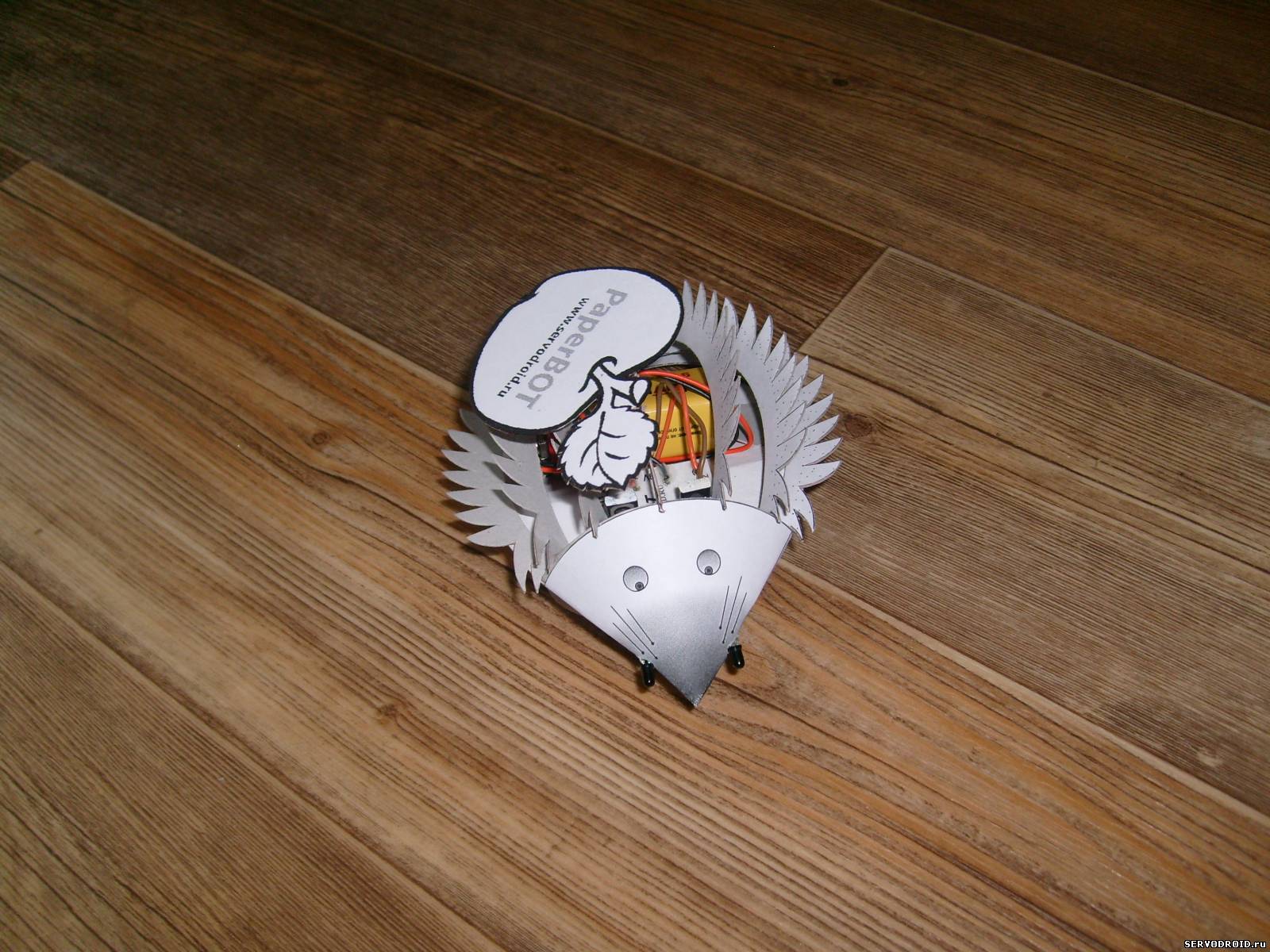 • Долго думал над дизайном данного робота, однако когда представил себе, как он будет двигаться, сомнений не осталось – это может быть только ёжик. Конструкция корпуса родилась в голове сразу. На полоске картона, согнутой в треугольник, закрепил два двигателя. Это шасси приклеил к основной платформе, выполненной в виде капли из двух слоев картона. Мордочку выполнил в виде конуса, к ней же торцом приклеил и иголки ежа. Сзади иголки не приклеены к корпусу, а просто склеены между собой, что позволяет их приподнимать и вынимать батарейку для замены. Ну а какой же ёжик бывает без яблочка на иголках?