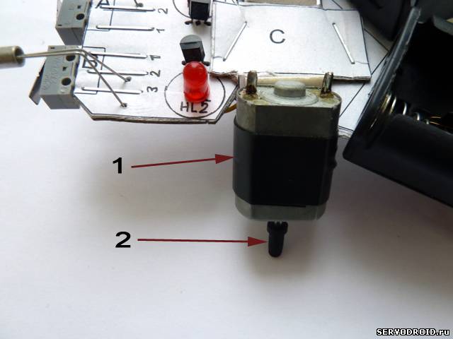Начните с подключения вывода1 от мотора M1 и вывода1 от мотора M2. Припаяйте выводы в головной части (фото.50) перекрёстно к скобам подпаянным к выводам "1" микропереключателей SF1,SF2. Оставшиеся выводы2 обоих моторов M1,M2 соединяют вместе и припаивают к общему выводу "O" источника питания на скобу. ![]() Фото.50.Подключение выводов моторов. Нажмите для увеличения. Шаг.12.Изготовление и монтаж панциря.
