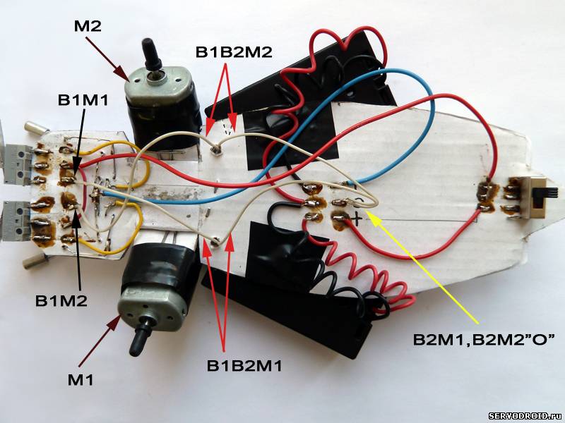 Переверните робота и продолжите подключение моторов. Определимся заранее, что выводами моторов будут называться проводки подключенные к моторам. На фото.50. показаны следующие обозначения: M1M2-мотор1 и мотор2; B1B2M1-вывод1 и вывод2 мотора M1; B1B2M2-вывод1 и вывод2 мотора M2; B2M1,B2M2"O"-вывод1 и вывод2 моторов M1 и M2 подключены к общему выводу; B1M1-вывод1 мотора M1; B1M2- вывод1 мотора M2.