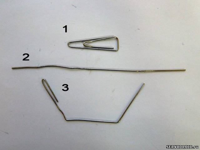 Тактильные усы изготавливают из канцелярских скрепок. Вам потребуется две скрепки, которые необходимо разогнуть в прямую линию. Придайте форму скрепке как на фото.65. Загните один конец скрепки на длину примерно чуть более половины, а второй конец на 5мм (фото.66). Точно также выгните вторую скрепку.