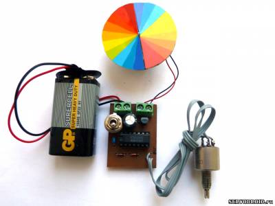 Как пример была создана флеш-программа с интерактивными элементами управления. Управляйте скоростью вращения цветного диска с помощью ползункового переменного резистора. ИНСТРУКЦИЯ: включите перекидной тумблер, после появления диска захватите его мышкой и наденьте на ось мотора, управляйте скоростью вращения диска ползунковым регулятором.